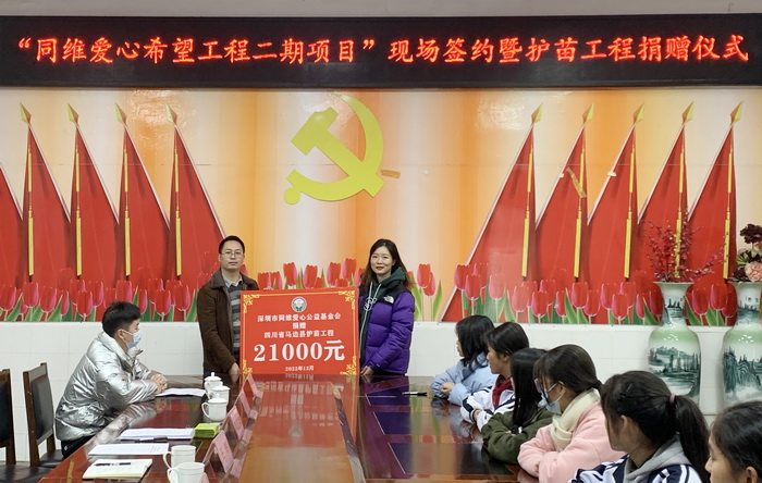 On December 2, the on-site signing ceremony of the second phase of T&W Love Hope Project and the donation ceremony of seedling protection project were held in Mabian Yi Autonomous County Middle School. Wang Hui, Party member and Deputy Director of Education Bureau of Mabian Yi Autonomous County, Tao Ruina, Mao Renming and Tu Hanfa, representatives of Shenzhen T&W Love Public Welfare Foundation, Yuan Guoliang, Head of Student Financial Assistance Management Middle School of Education Bureau of Mabian Yi Autonomous County, Moxi Dantie, Principal of Mabian T&W Hope Primary School, and Anian Labu, Head of financial assistance work of Mabian Middle School attended the meeting.